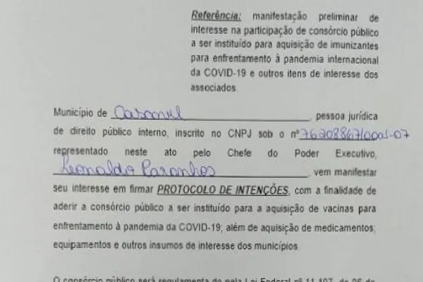 O prefeito de Cascavel, Leonaldo Paranhos, assinou na manhã de hoje (2) o protocolo de manifestação de interesse do consórcio público da Frente Nacional de Prefeitos que tem como foco a aquisição de vacinas para o enfrentamento à pandemia de Covid-19, além da aquisição de medicamentos, equipamentos e outros insumos.