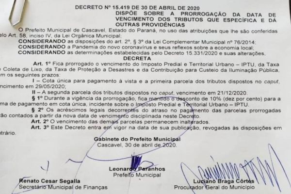 Vencimento do IPTU e Taxa de Coleta de Lixo é prorrogado mais uma vez em Cascavel