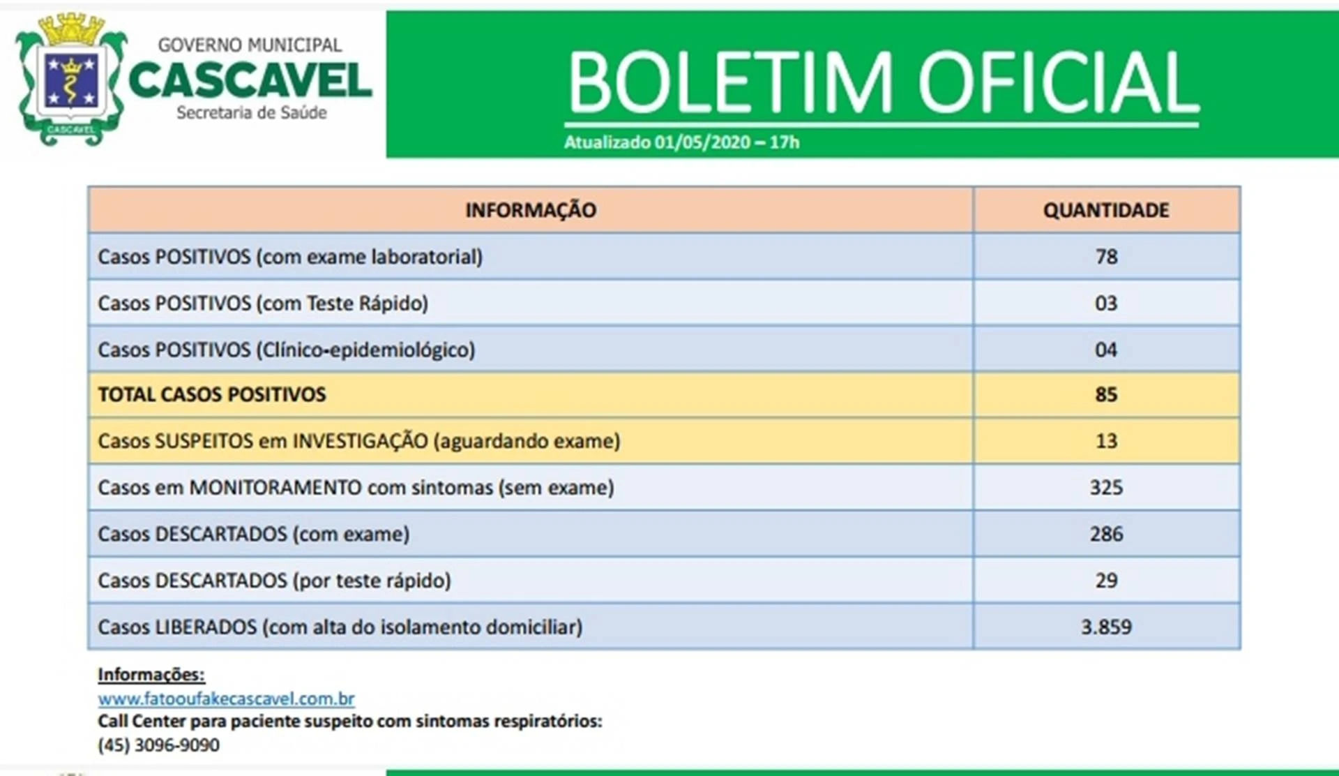 A Secretaria de Saúde de Cascavel divulgou no fim da tarde desta sexta-feira (1) o boletim atualizado do novo coronavírus no município. A cidade já tem 85 casos confirmados da doença e 13 aguardam o resultado dos exames.