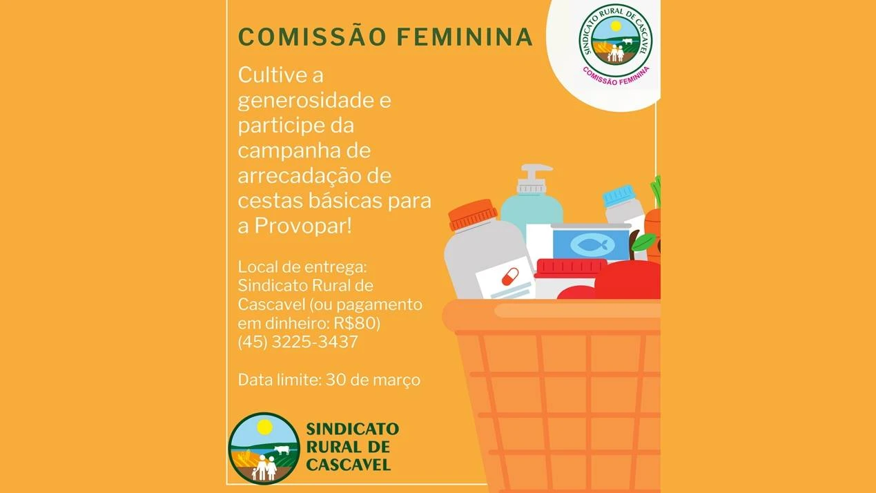A Comissão Feminina do Sindicato Rural de Cascavel está colaborando com a campanha lançada pela Provopar de Cascavel. O objetivo é arrecadar cestas básicas para garantir o funcionamento da Cozinha Social da entidade, que serve 450 refeições por dia. “Contamos com a colaboração e generosidade de todos. Neste momento de muita dor e tristeza devido à Covid-19, precisamos ajudar ainda mais quem precisa”, comentou Maria Beatriz Orso, presidente da Comissão. As cestas (ou o dinheiro) podem ser entregues até o dia 30 de março no Sindicato Rural de Cascavel.