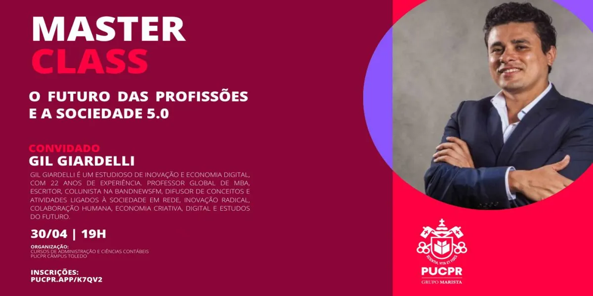 É com o objetivo de mapear possíveis cenários futuros que a Pontifícia Universidade Católica do Paraná (PUCPR) - Câmpus Toledo - vai realizar o evento “O Futuro das Profissões e a Sociedade 5.0”, marcado para o dia 30 de abril, às 19h. A palestra ficará a cargo do professor e escritor Gil Giardelli, especialista em inovação radical.